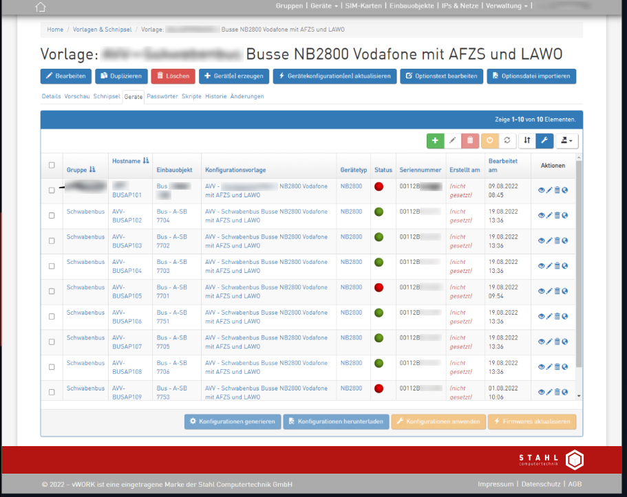Sie erhalten genau die Funktionen, die Sie für einen reibungslosen Betrieb Ihrer Geräte von NetModule, Moxa und weiteren Herstellern brauchen: Sparen Sie Zeit und Aufwand bei der Erstellung und Verteilung von Konfigurationen. Und verzichten Sie endgültig auf Excel-Listen, um eine Vielzahl an Geräten, Fahrzeugen, Passwörtern, IP-Adressen, SIM-Karten etc. im Blick zu haben. Software und Daten werden wahlweise in Ihrem eigenen Rechenzentrum oder in der STAHL-eigenen Cloud gehostet. Durch die webbasierte Oberfläche können Mitarbeiter überall und zugleich sicher auf die Software zugreifen.